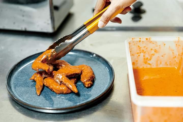 - 將熱炸雞放入盆中與醬汁拌勻