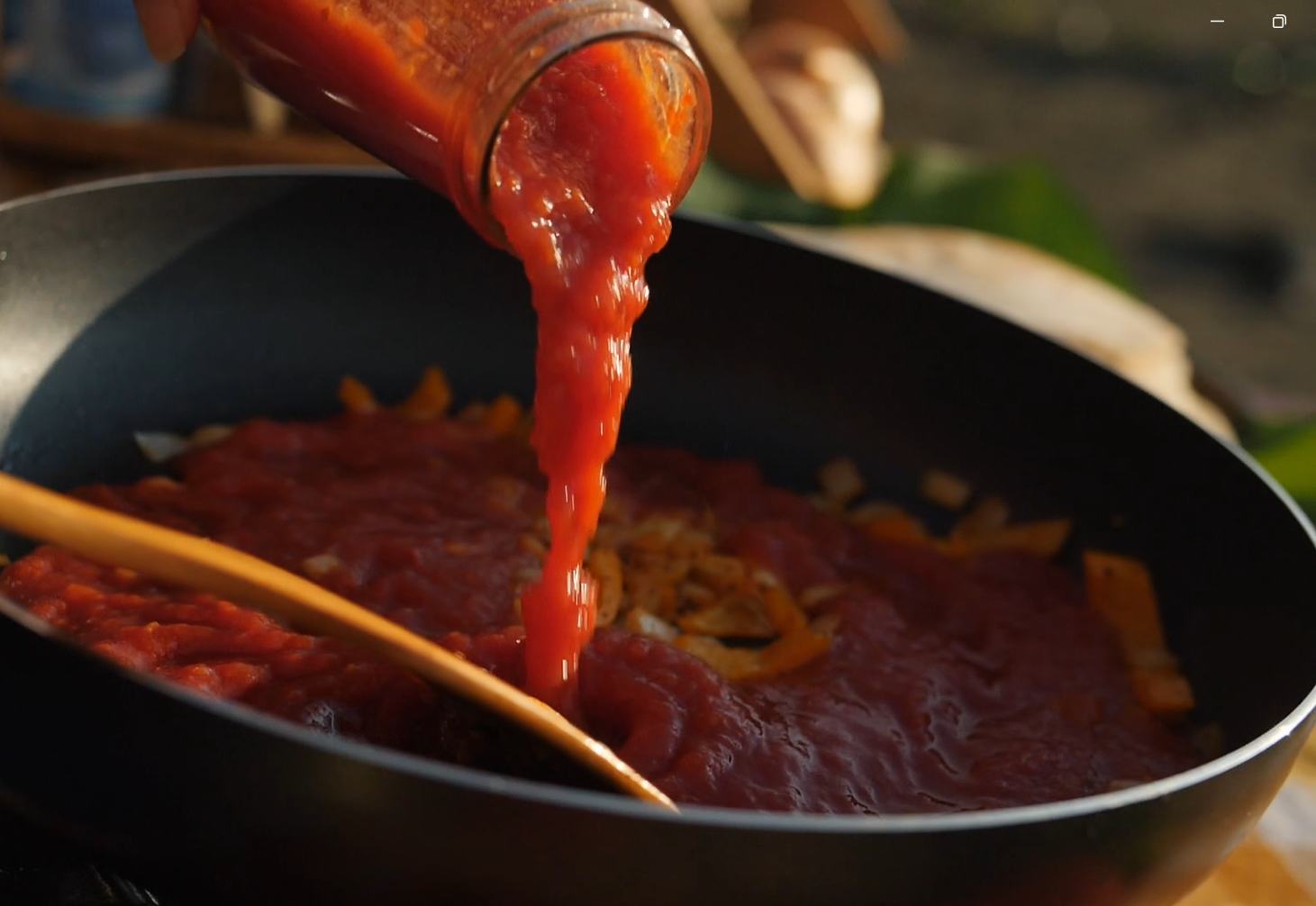 2. 拌入番茄和Anita's辣醬,煮至番茄醬汁變稠。