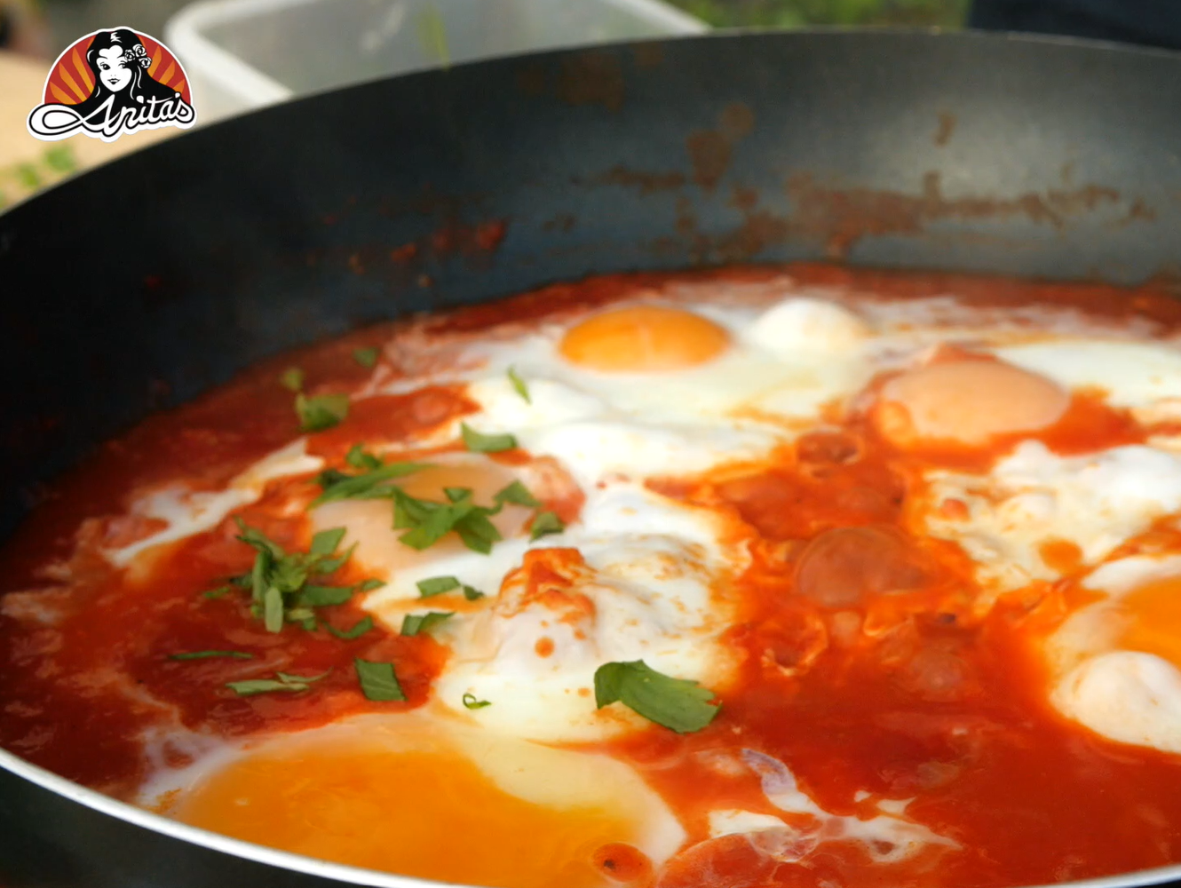 Shakshuka is a spicy tomato stew popular in both North Africa and the Middle east. It’s also spelled shakshuka. Because eggs are a main ingredient, it is often on breakfast menus but it is also a popular evening meal in Israel. Shakshuka means “mixed" in arabic. Probably referring to the vegetables in the dish rather than the eggs. Some variations include minced lamb.
